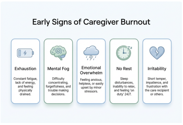 Caregiver burnout rarely happens all at once. It builds gradually and quietly. Early signs often include: